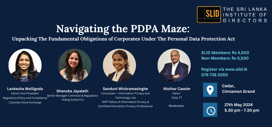 Navigating the PDPA Maze: Unpacking The Fundamental Obligations of Corporates Under The Personal Data Protection Act is a discussion organized by the Innovation and Technology Committee of The Sri Lanka Institute of Directors. This evening forum of the Sri Lanka Institute of Directors will shed light on how companies should prepare itself to comply with the salient requirements of the Personal Data Protection Act coming into full operation in March 2025.